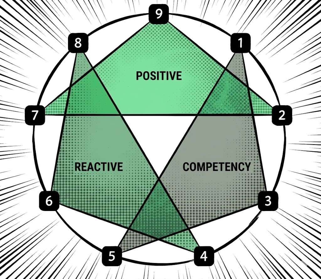 Enneagram 的 Harmonic Groups(和諧三組 / 情緒反應三組),用來看你在「遇到挫折、失望、衝突、壓力」時,情緒會怎麼走、你慣用哪一招把自己救回來(或把局面扳回來),也提醒你:這一招用過頭會出什麼事。